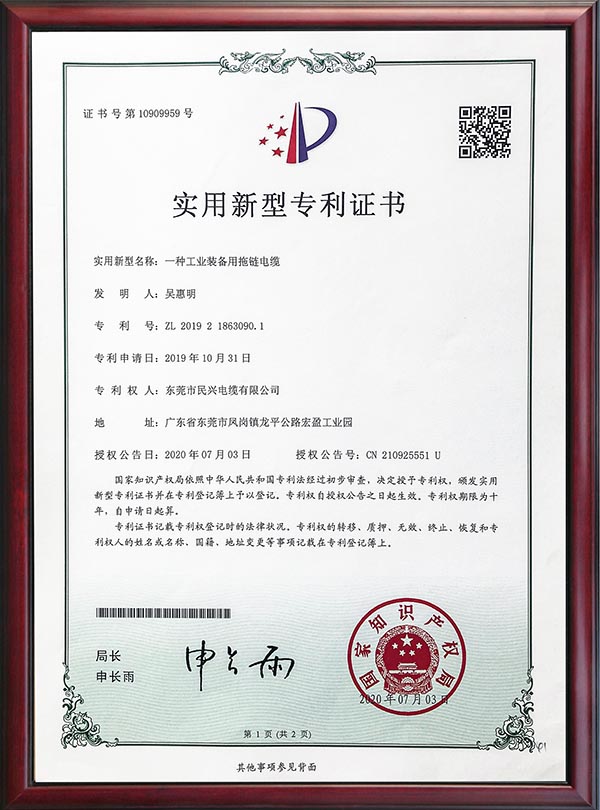• 專利證書-一種工業(yè)裝備用拖鏈電纜
