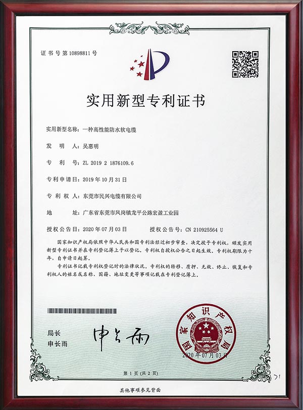 • 專利證書-一種高性能防水軟電纜