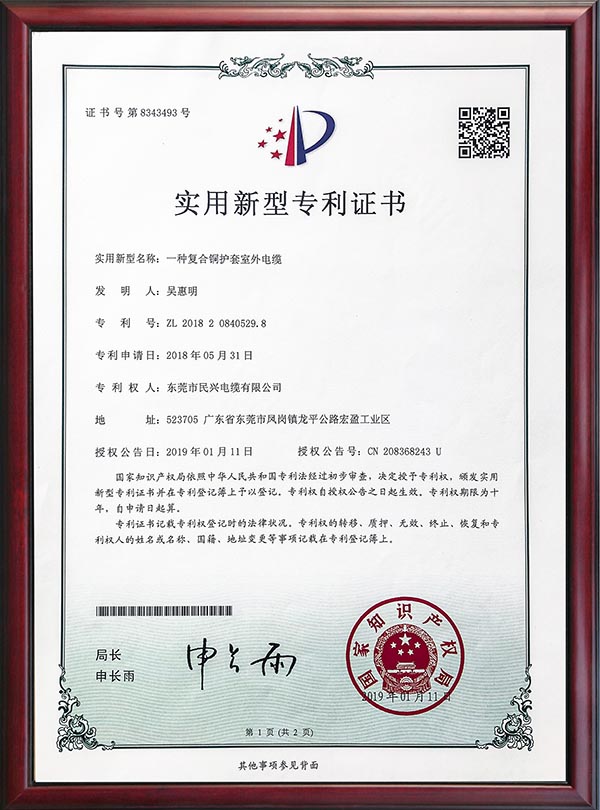 • 專利證書-一種復(fù)合銅護(hù)套室外電纜-2019