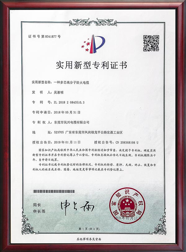 • 專利證書-一種多芯高分子防火電纜-2019