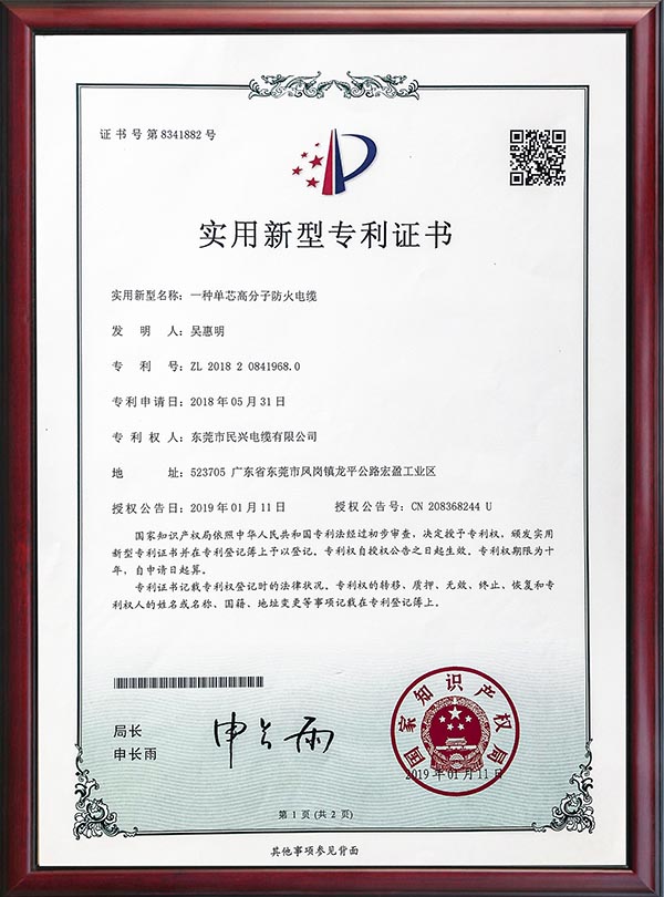 • 專利證書-一種單芯高分子防火電纜-2019