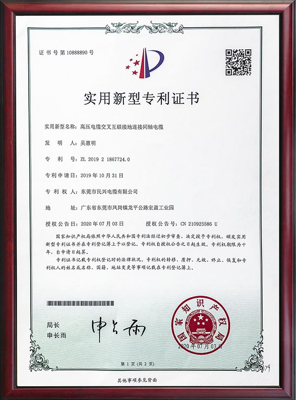 • 專利證書-高壓電纜交叉互聯(lián)接地連接同軸電纜