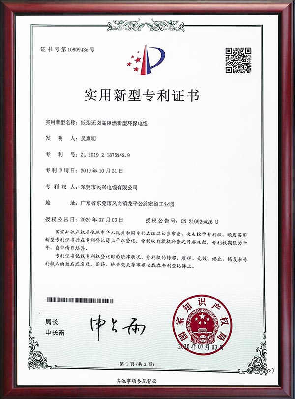 • 專利證書-低煙無鹵高阻燃新型環(huán)保電纜