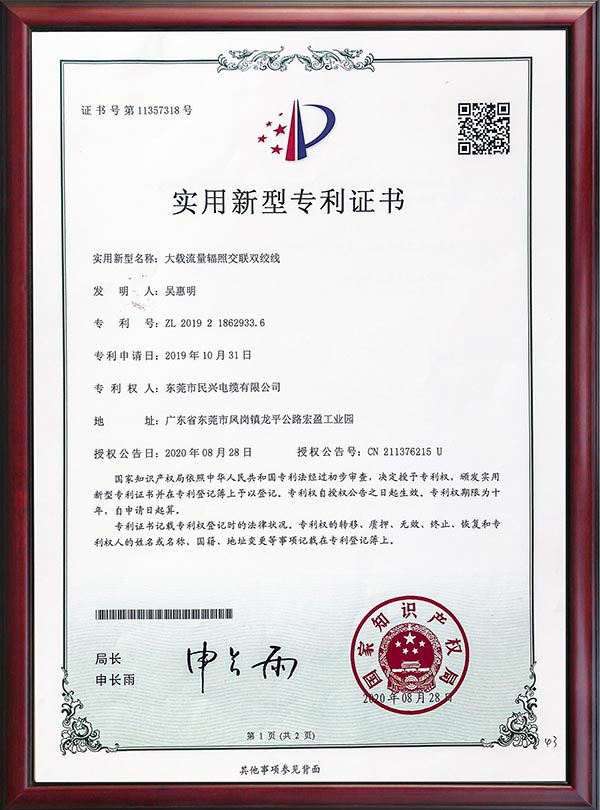 • 專利證書-大載流量輻照交聯(lián)雙絞線