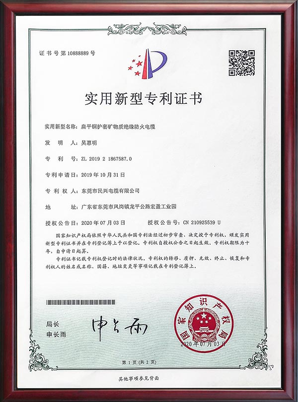 • 專利證書-扁平銅護(hù)套礦物質(zhì)絕緣防火電纜