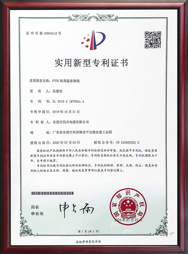 • 專利證書-PTFE耐高溫家裝線