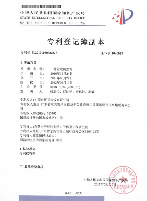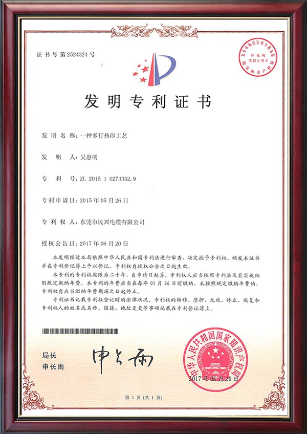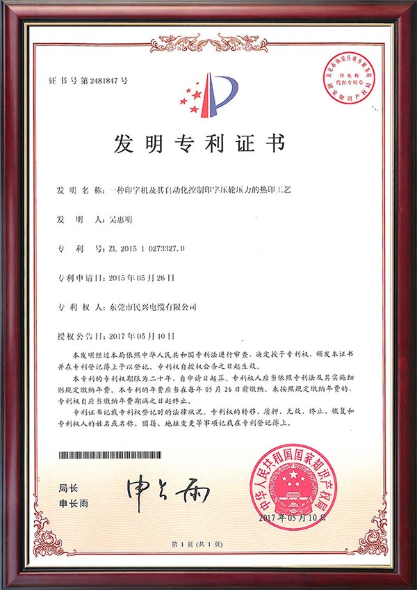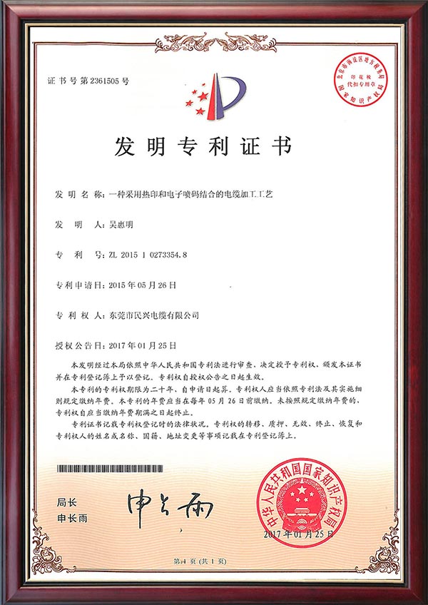 • 發(fā)明專利證書--一種采用熱印和電子噴碼結(jié)合的電纜加工工藝