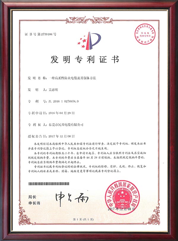 • 發(fā)明專利證書-一種高柔性防火電纜及其制備方法