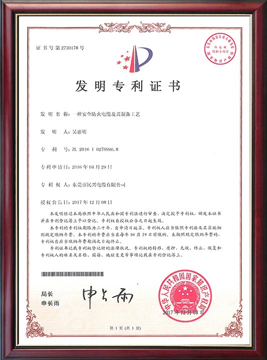 • 發(fā)明專利證書-一種安全防火電纜及其制備工藝